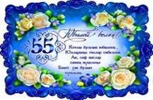 Сезне олы бәйрәмгез — 55 яшьлек юбилеегыз белән чын күңелдән котлыйбыз. Сезгә нык сәламәтлек, күңел тынычлыгы, гаилә шатлыгы, кайгы-хәсрәтсез көннәр, ак бәхетләр, балаларыгызның күңел җылысын тоеп, игелекләрен күреп, бәхетле озын гомер кичерүегезне телибез. Киләчәгегез җыр кебек матур, кояш кебек якты булсын. Туачак таңнарың һәрвакыт нурлы, күк йөзең һәрвакыт аяз булсын. Гел шулай елмаеп, кешеләрне сөендереп яшәгез!