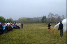 После эвакуации учащимся было разъяснено как сшить повязку. На стадионе школы учащиеся попробовали применить в действии огнетушитель.