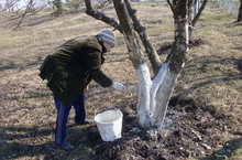 3 мая в МБОУ "Александровская ООШ", несмотря на погоду, технический персонал белил бордюры и яблони в саду.