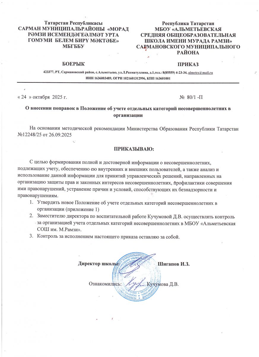 Приказ о внесении поправок в Положение об учете отдельных категорий несовершеннолетних в организации