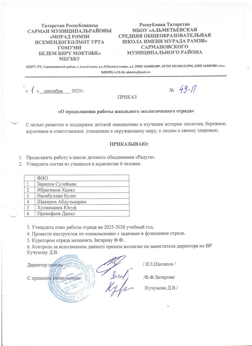 Приказ о продолжении работы Эко-отряда в 2025-2026 учебном году