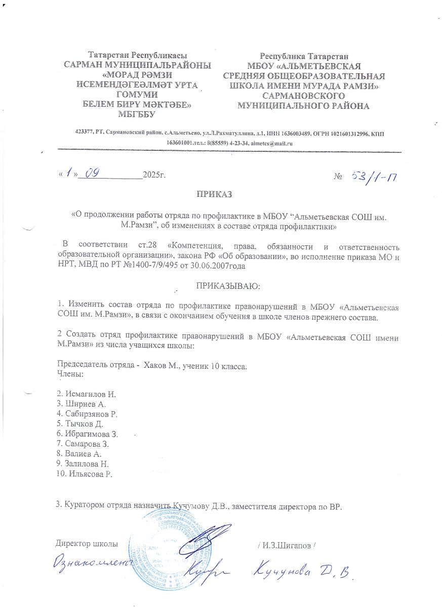 Приказ о продолжении работы отряда по профилактике правонарушений в 2025-2026 учебном году