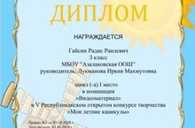 Поздравляем! 08.10.2024 Ученик 3 класса МБОУ "Азалаковская ООШ" Гайсин Радис занял I место в V Республиканском открытом конкурсе творчества "Мои летние каникулы" в номинации "Видеоматериал" и награжден дипломом Министерства образования и науки Республики Татарстан. Поздравляем, Радис! Руководитель: Лукманова И.М.