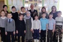 15 февраль көнне илебез Совет гаскәрләренең Әфганстаннан чыгарылган көнен искә ала. 1989 елдан башлап бу көн илебездә Әфганчылар көне буларак билгеләп үтелә. Шул уңайдан, башлангыч класс укучылары Әфганстанда хезмәт иткән авылдашыбыз Хакимуллин Данил Гыйздулла улы белән очрашты. Данил абыйлары истәлекләр, хатирәләр белән уртаклашты, балаларга яхшы укырга, өлкәннәр сүзен һәрвакыт тыңларга, кыю, җитез, спорт сөючән, илеңә тугрылыклы патриотлар булып үсүләрен теләп, изге теләкләрен юллады.\15 февраля наша страна отмечает День вывода советских войск из Афганистана. С 1989 года этот день отмечается в нашей стране как день афганцев. В связи с этим учащиеся начальных классов встретились с односельчанином Хакимуллиным Данилом Гиздулловичем, служившим в Афганистане. Он поделился воспоминаниями, пожелал детям хорошо учиться, всегда слушать взрослых, быть смелыми, ловкими, спортивными, преданными своей стране патриотами.
