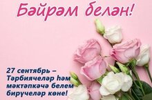27 сентября – День воспитателя и всех дошкольных работников 27.09.2025 27 сентябрь — Рәсәйдә тәрбияче һәм мәктәпкәчә яшьтәге балаларга белем бирүче тәрбиячеләр көне. Баланың якын дусты, сердәшчесе, тормышка беренче адымнарын ясарга ярдәм итүче мөгаллимнәр аерым игътибарга лаек! Бәйрәм уңаеннан, озак еллар балалар бакчасында эшләп, бүгенге көндә лаеклы ялдагы хөрмәтле ветеран тәрбиячеләребезне - Хадиева Венера Әзһәр кызын, Миннегалиева Саимә Кәрим кызын, шулай ук бүгенге көндә балалар бакчасында хезмәт куючы хөрмәтле тәрбиячеләребезне ихлас күңелдән һөнәри бәйрәмнәре белән котлыйбыз! Авыр хезмәтегездә түземлек, гаиләгездә җан тынычлыгы, тормышыгызда ак бәхетләр һәм сәламәтлек телибез! Сезгә олы рәхмәтләребезне җиткерәбез! Барлык балаларыгыз да тәүфыйклы, акыллы булсыннар!