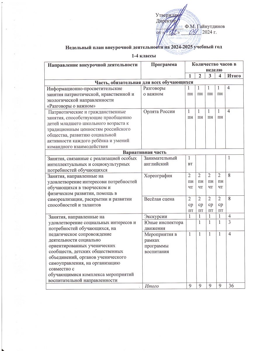 Недельный план внеурочной деятельности на 2024-2025 учебный год 1-4 классы