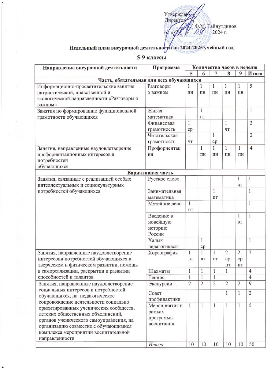Недельный план внеурочной деятельности на 2024-2025 учебный год 5-9 классы