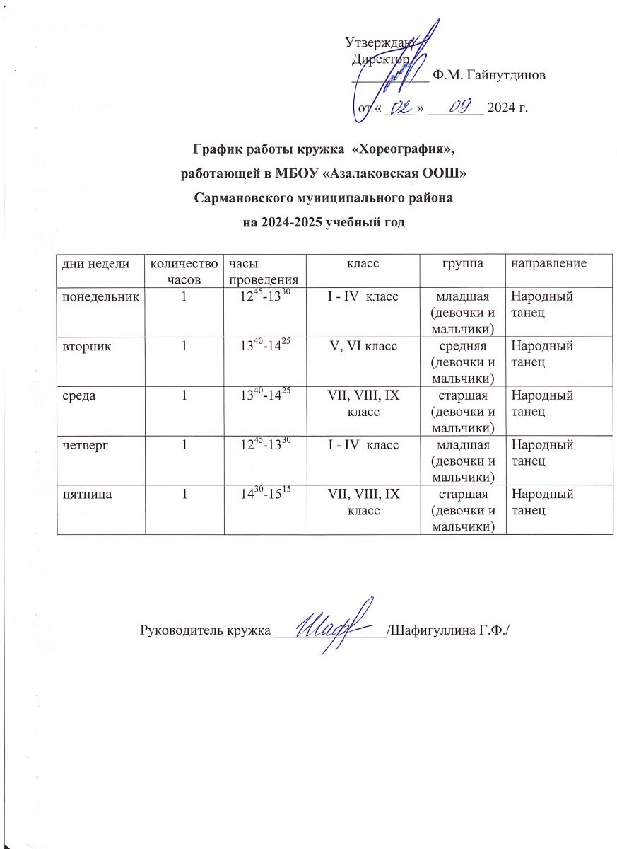 График работы кружка "Хореография" МБОУ "Азалаковская ООШ" на 2024-2025 учебный год