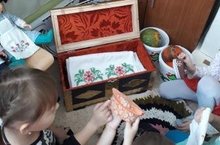 Әбиемнең күңел сандыгы!Нинди серләр саклый икән ул?Гомер буе җыйган хәзинәме,Әллә инде күңел бизәгеме,Нинди серләр саклый икән ул?Ач, әбием, безгә күңелеңне,Яшь буынга мирас булып калсын,Бер хәзинә калсын үткәннән.Балаларда татар милли киемнәренә һәм бизәнү әйберләренә кызыксыну тәрбияләп, “Әбиемнең сандыгы” дигән темага шөгыль үтте. Балалар татар милли киемнәре һәм бизәнү әйберләре: бәби итәкле күлмәк, чиккән сөлге, сәйлән белән чигелгән калфак,түбәтәй, беләзек һ.б. белән таныштылар, “Түбәтәйле” уенын уйнадылар.Воспитывая у детей интерес к татарским национальным костюмам и украшениям, прошло занятие на тему “Бабушкин сундук”. Дети познакомились с татарскими национальными костюмами и украшениями: вышитым полотенцем, тюбетейками, браслетами и т.д., сыграли в игру “Тюбетейка”. -