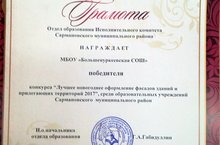 МБОУ «Большенуркеевская СОШ» награждена Грамотой отдела образования исполнительного комитета Сармановского муниципального района за победу в конкурсе «Лушчее новогоднее оформление фасадов зданий и прилегающих территорий 2017 года» среди образовательных учреждений Сармановского муниципального района.