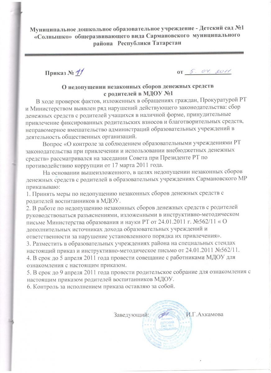 Приказ о недопущении незаконных сборов денежных средств 1 стр.jpg