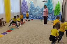 Икенче кечкенәләр төркемендә Римма Ханифовна балалар белән төрле хәрәкәтләр ясап балаларнын физик үсешләрен үстерә/ Римма Ханифовна во второй младшей группе проводит интересные занятия