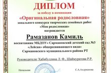 Воспитанник старшей группы Рамазанов Камиль стал победителем в зональном конкурсе творческих семейных работ "Моя родословная" в номинации "Оригинальная родословная", руководители Хабибуллина Лилия Федоровна, Шаймуратова Регина Ришатовна/ Өлкән төркемдә тәрбияләнүче Рамазанов Камил "Минем шәҗәрәм" иҗади гаилә эшләре зона конкурсында "үзенчәлекле шәҗәрәм" номинациясендә җиңүче булды, җитәкчеләре Хәбибуллина Лилия Федор кызы, Шәйморатова Регина Ришат кызы/