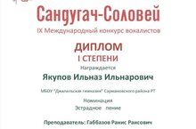 В феврале текущего года в г. Казань прошел IX Международный конкурс вокалистов «Сандугач-Соловей» народной артистки РФ и РТ Ганеевой Винеры Ахатовны в очной и заочной форме. В заочной форме участие принял ученик 9Б класса МБОУ «Джалильская гимназия» Якупов Ильназ (преподаватель Габбазов Ранис Раисович), и стал победителем в своей возрастной категории в номинации эстрадное пение (вокал-соло). Поздравляем Ильназа с этой победой и желаем дальнейших творческих успехов!