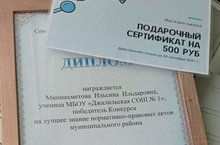 Ученица Джалильской школы №1 Миннахметова Ильсина стала победителем конкурса на лучшее знание нормативно-правовых актов муниципального района, учитель Ягудина З.Ф. Ильсина была награждена грамотой и денежным сертификатом. Поздравляем и желаем новых побед и достижений!
