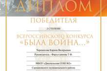 Черемисова Карина, ученица 4В класса Джалильской СОШ №2, получила Диплом победителя 2 степени за проект «Фронтовые Письма» во Всероссийском конкурсе «Была война».