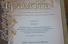 4 февраля 2020 года были подведены итоги муниципального этапа республиканского фестиваля-конкурса школьных театральных коллективов на иностранных языках "School performance". Театральный коллектив 3-4 классов нашей школы занял призовое место. Мы поздравляем наших ребят и желаем им дальнейших успехов!