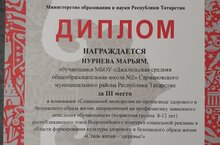 В начале сентября прошел муниципальный этап Всероссийского конкурса социальной рекламы в области формирования культуры здорового и безопасного образа жизни «Стиль жизни – здоровье». Работа нашей ученицы Нуриевой Марьям заняла 1 место и была отправлена на республиканский этап. И вот долгожданный результат: 3 место в номинации «Социальный видеоролик по пропаганде здорового и безопасного образа жизни, направленный на профилактику зависимого поведения обучающихся».