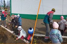Мәктәпкә әзерлек төркем балалары, безнең ишегалды себерүчесенә чәчәк түтәлләрен тәртипкә китерергә булыштылар.