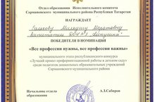 Саляхова М.М. стала победителем муниципального этапа республиканского конкурса «Лучший проект профориентационной работы в детском саду» среди педагогов дошкольных образовательных учреждений Сармановского муниципального района. 04.12.2019