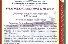 Благодарственное письмо от Совета поселка городского типа Джалиль Сармановского муниципального района Республики Татарстан 27.12.2018