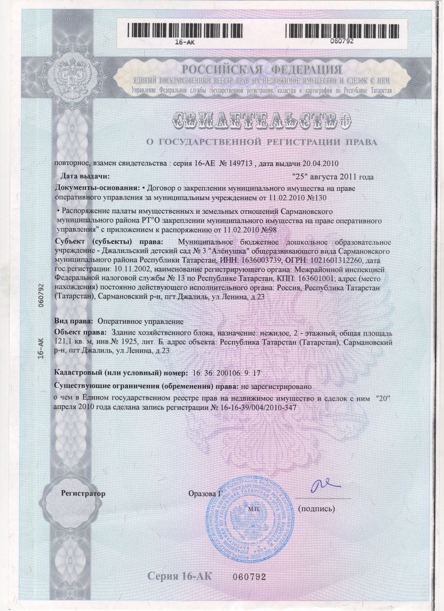 Свидетельство о государственной регистрации права на здание хозяйственного блока