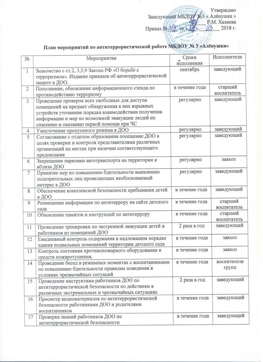 План мероприятий по антитеррористической работе МБДОУ №3 "Алёнушка", 2018г