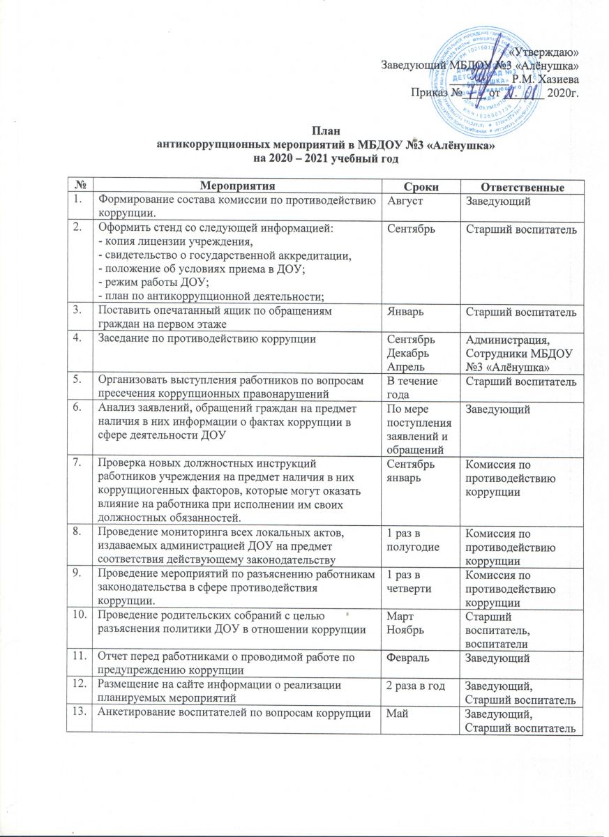 План антикоррупционных мероприятий на 2020-2021 учебный год