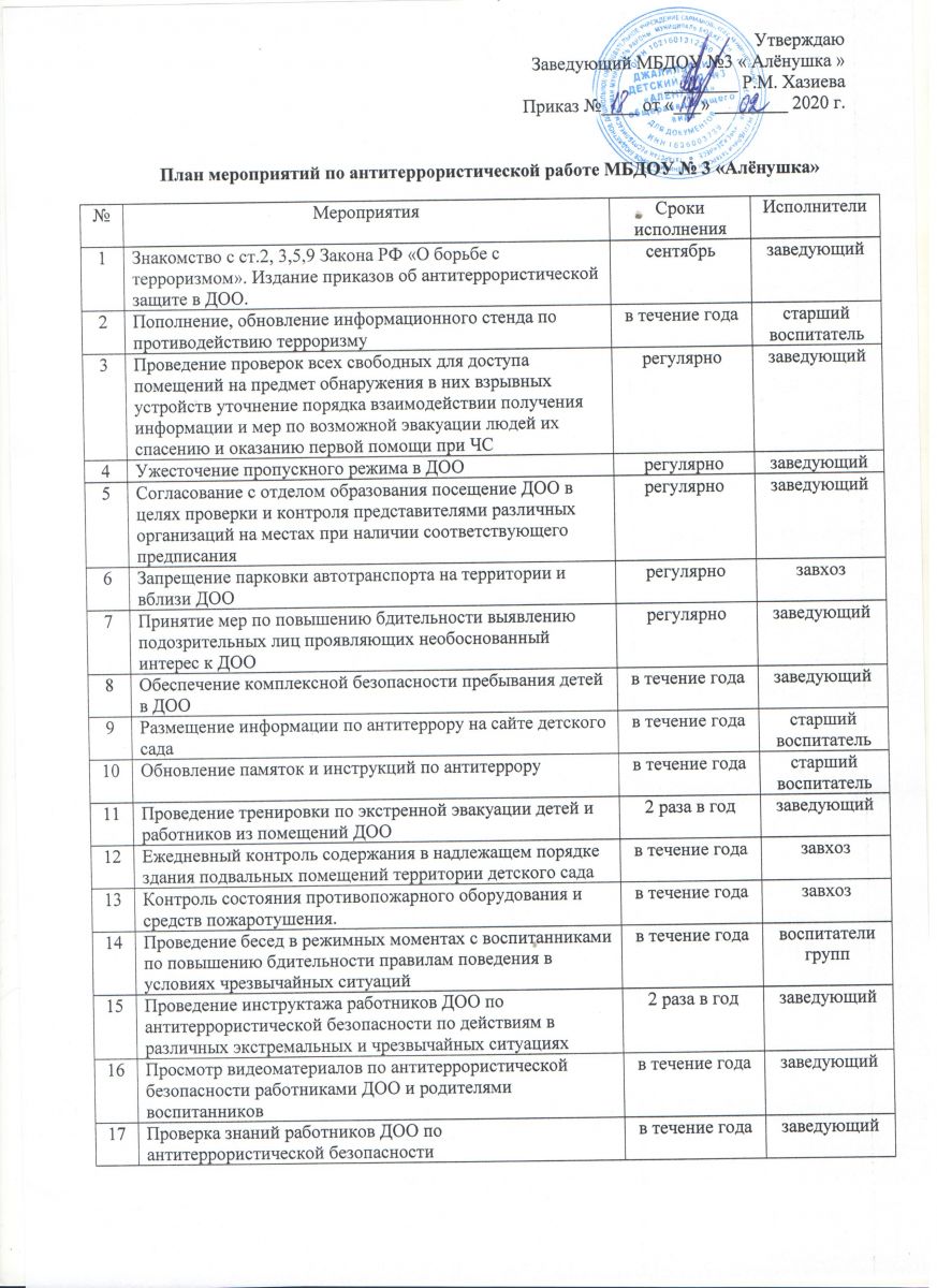 План мероприятий по антитеррористической работе МБДОУ №3 "Алёнушка", 2020г
