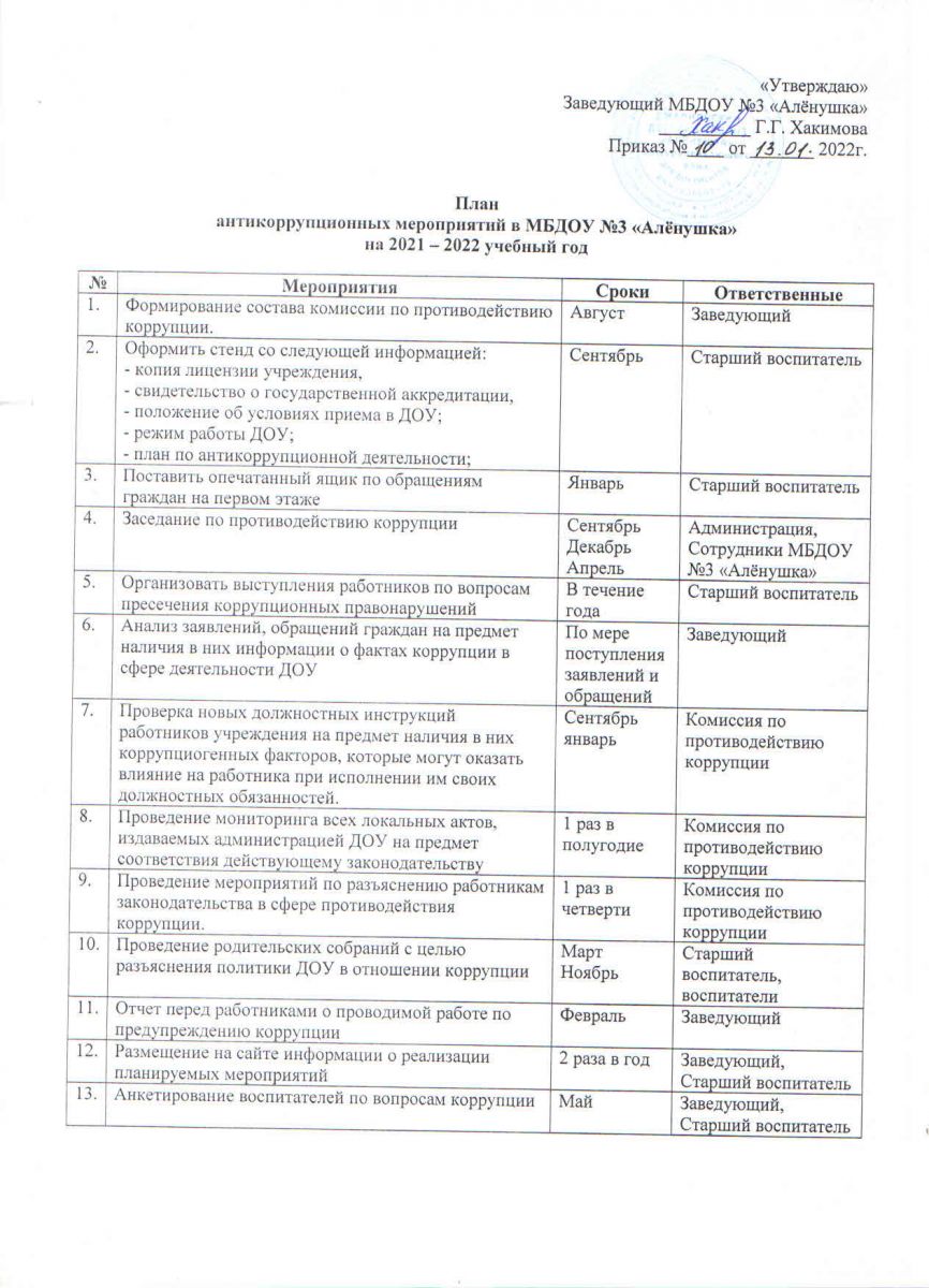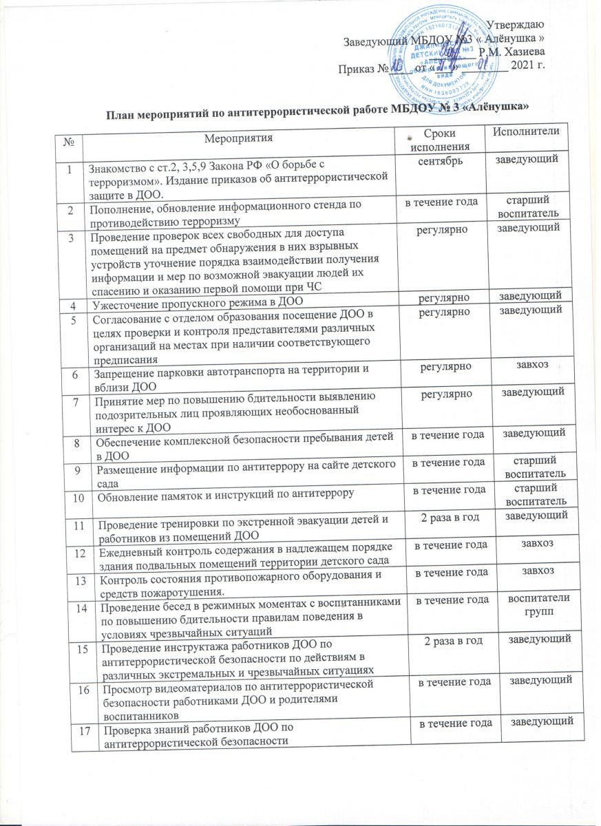 План мероприятий по антитеррористической работе МБДОУ №3 "Алёнушка", 2021г