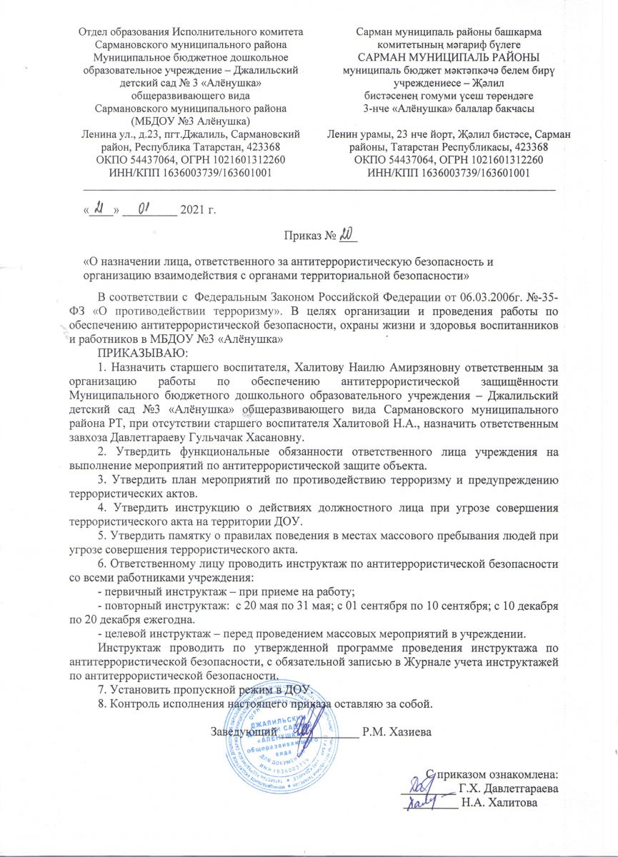 Приказ "О назначении ответственного по антитеррористической защищенности на 2021 г"