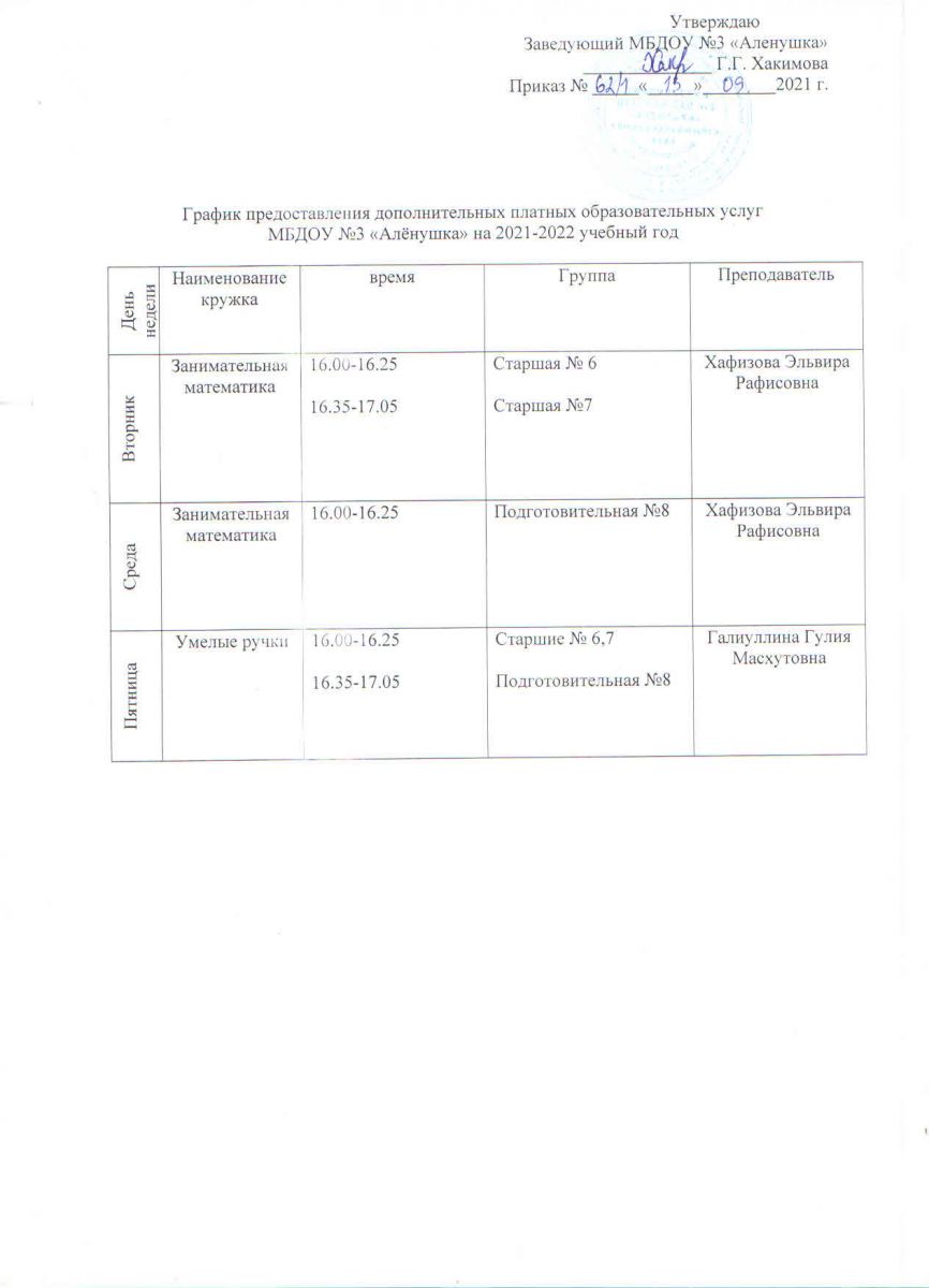 График предоставления дополнительных платных услуг МБДОУ №3 "Алёнушка" на 2021-2022 учебный год