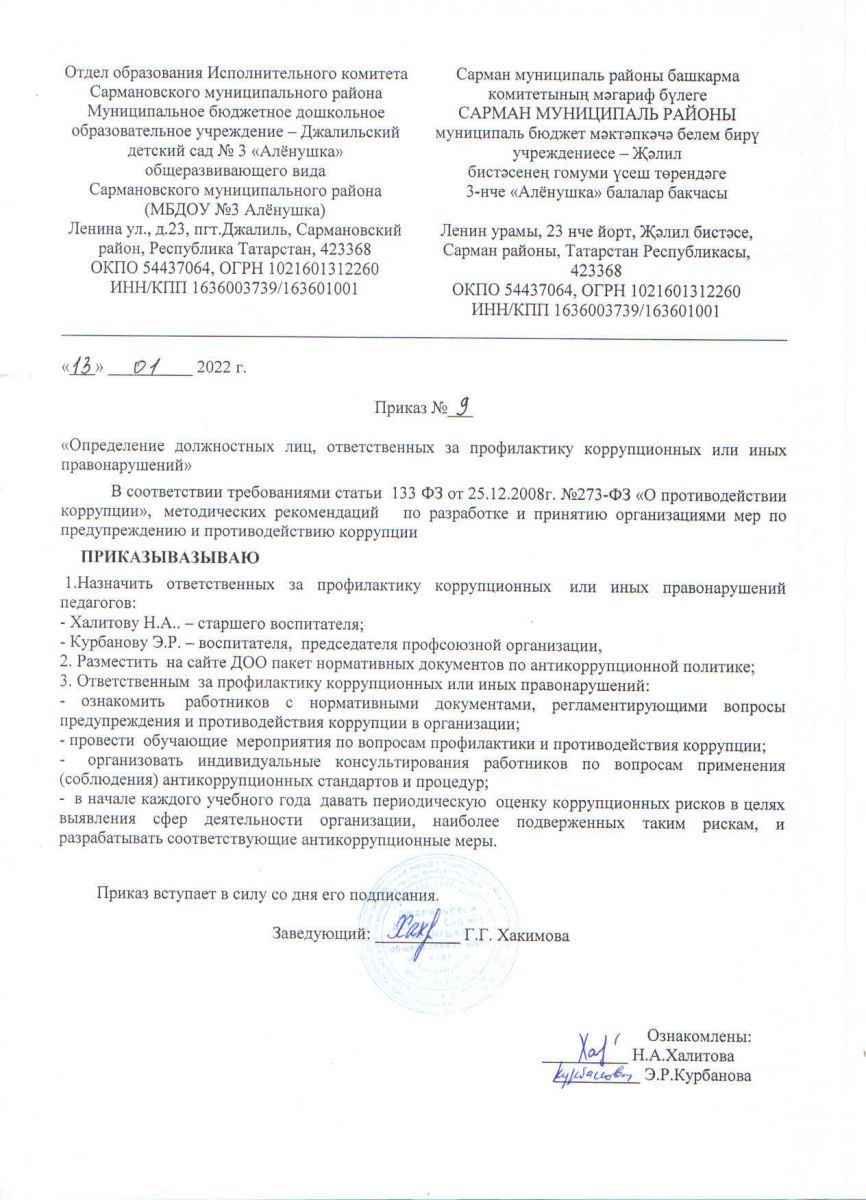 Приказ об исполнении законадательства о противодействии коррупции, 2022 год