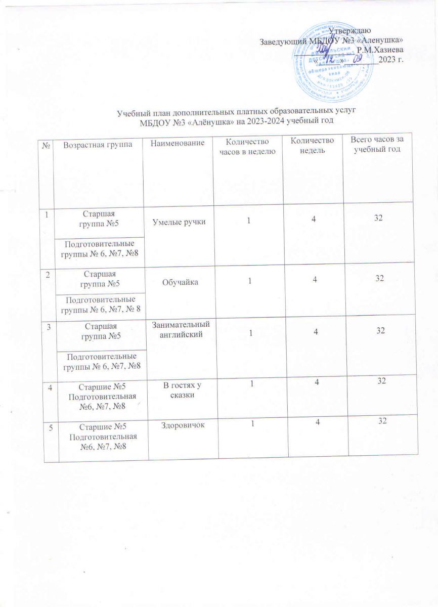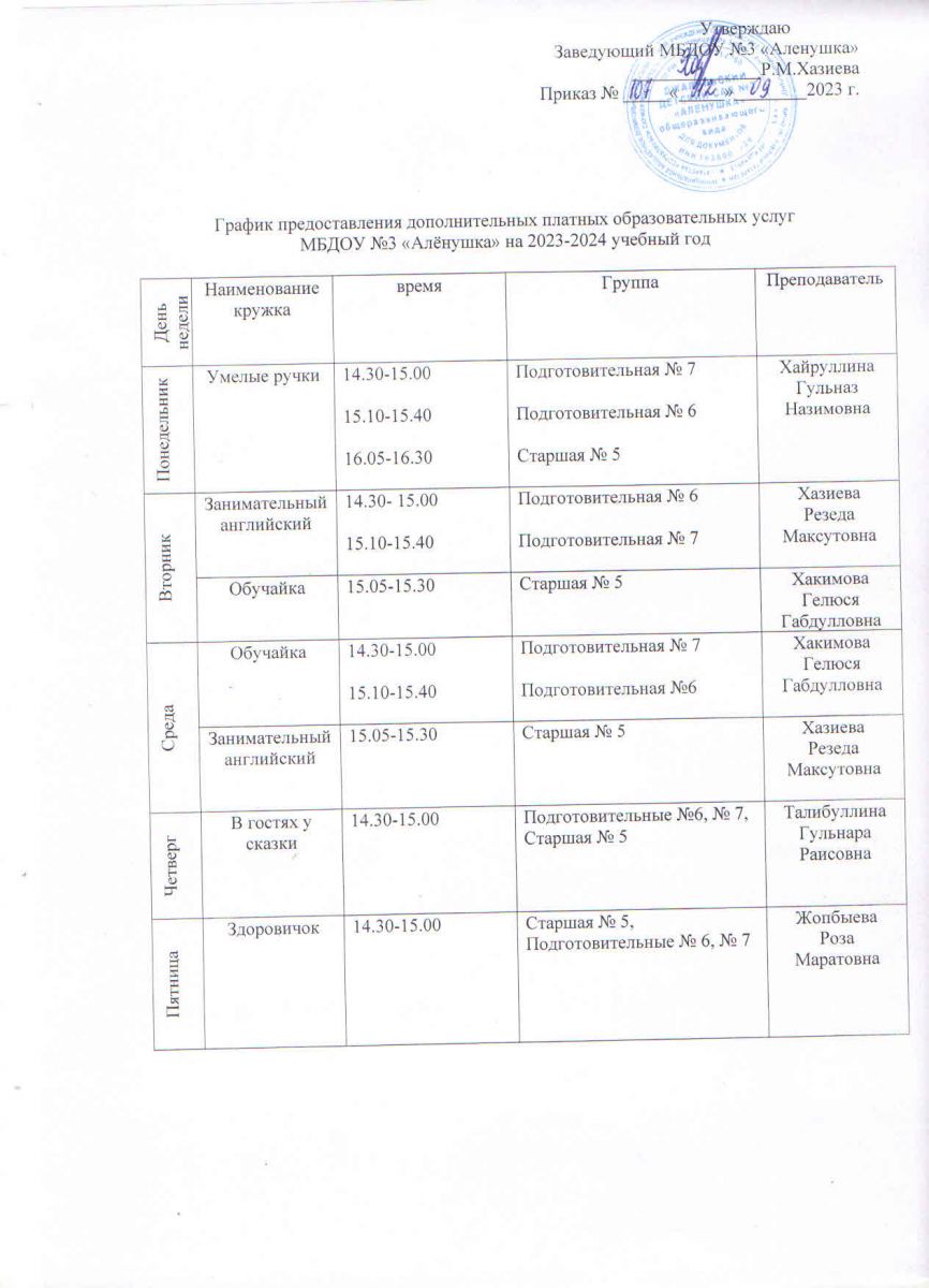График предоставления дополнительных платных услуг МБДОУ №3 "Алёнушка" на 2023-2024 учебный год
