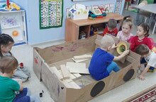 Даже в скромной картонной коробке таятся безграничные возможности. С утра я принесла из дома большую картонную коробку. А наши малыши тут же придумали, что с ней делать. Ильдан предложил сделать машину, и работа закипела, потом захотели раскрасить, Оля сказала, нужны колеса, стали клеить колеса, потом кто-то предложил сделать сиденья, побежали за бабашками… В общем работа во второй младшей группе кипела целый день. Детская фантазия способна за секунду создавать и разрушать целые миры. И если нам, взрослым, это кажется необычным и недостижимым, то для детей это обычное дело.