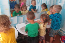 - открыть кран с водой, намочить правую ладошку и провести ею от кончиков пальцев до локтя левой руки, сказать «раз»; то же проделать левой рукой.