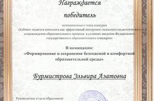 Завершился муниципальный этап конкурса "Кабинет педагога - психолога как эффективный инструмент психолого - педагогического сопровождения образовательного процесса в условиях введения ФГОС". Наш педагог - психолог Бурмистрова Эльвира Азатовна стала победителем в номинации "Формирование и сохранение безопасной и кофортно образовательнойсреды". Поздравляем ее и желаем творческих успехов в работе!