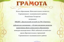 Грамота победителя в муниципальном конкурсе в номинации "Лучшее внедрение вариативных форм дошкольного образования"\ Безнең балалар бакчасы "Минем яраткан балалар бакчасы" дигэн муниципаль видеоролик конкурсында катнаштык һәм грамотага лаек балдык.