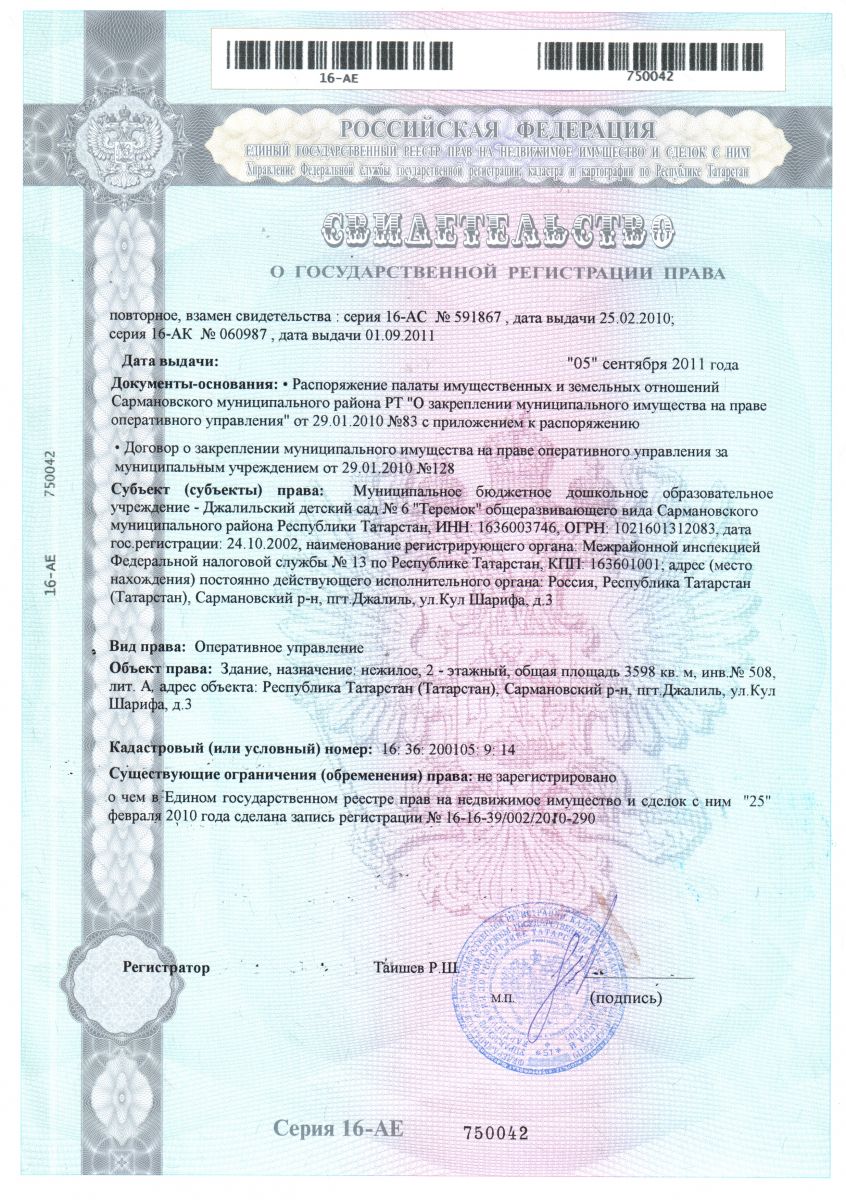 Муниципальное бюджетное дошкольное образовательное учреждение-Джалильский детский сад №6 "Теремок" общеразвивающего вида Сармановского муниципального района Республики Татарстан/Сарман муниципаль районы муниципаль бюджет мәктәпкәчә белем бирү учреждениесе - Җэлил бистәсенең гомуми үсеш төрендәге 6-нчы "Теремкәй" балалар бакчасы