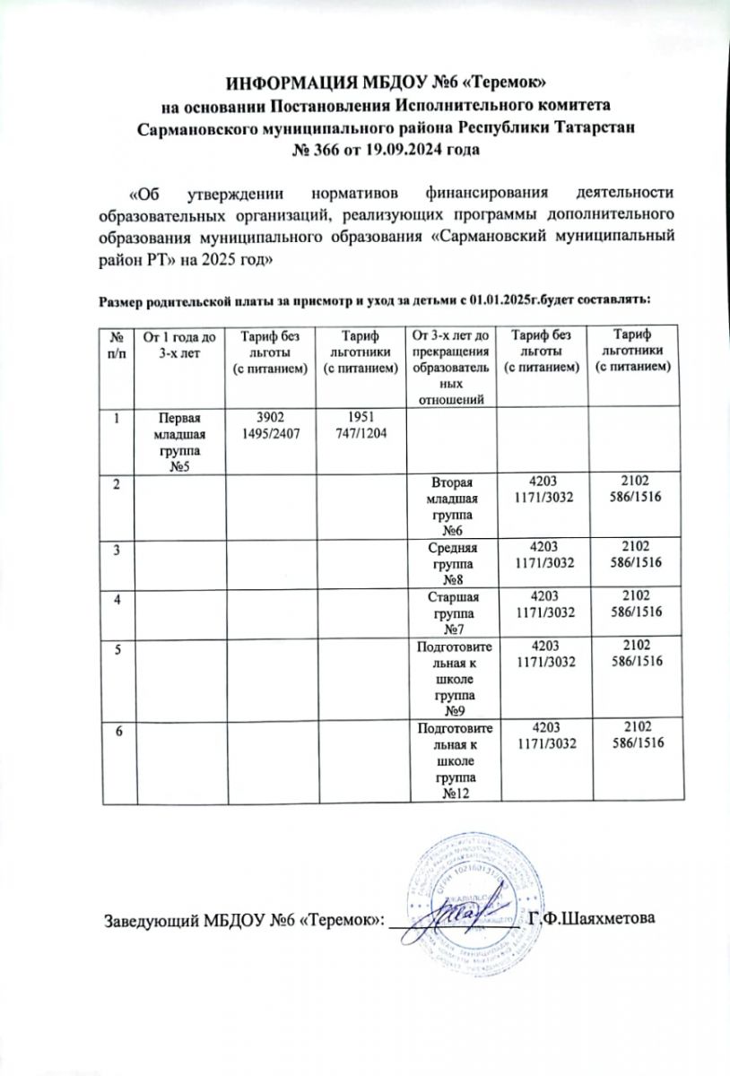 Постановление №366 от 19.09.2024г "Об утверждении родительской платы за присмотр и уход за детьми на 2025г