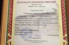 Воспитатель Багауова Земфира Саббуховна за свой добросовестный труд награждена благодартвенным письмом Главы муниципального образования "поселок городского типа Джалиль" Р.А. Каримова.