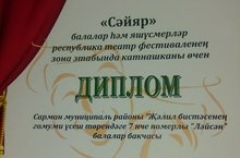 Коллектив детского сада награжден дипломом участника зонального этапа республиканского конкурс - фестиваля детских и юношеских театров "Сайяр" / Балалар бакчасы коллективы "Сәйяр" балалар һәм яшүсмерләр республика театр фестиваленең зона этабында катнашканы өчен диплом белән бүләкләнде