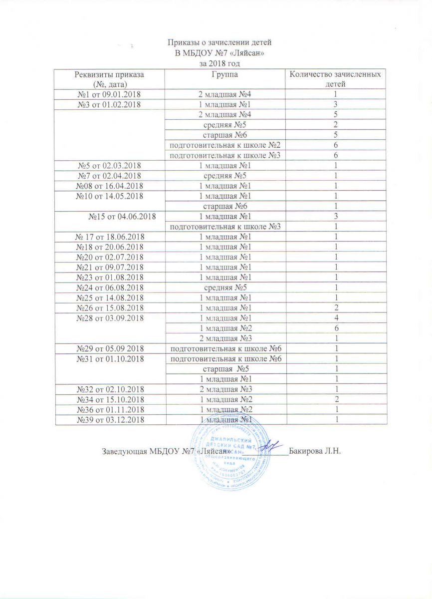Приказы о зачислении детей в МБДОУ №7 Ляйсан