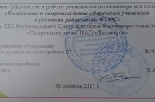 Сарман гимназиясе укытучылары Түбән Кама шәһәрендә узган "Выявление и сопровождение одаренных учащихся в условиях реализации ФГОС" региональ семинарында катнаштылар, мастер-класслар карадылар.