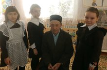 Янурыс башлангыч белем бирү мэктэбе укучылары, тыл ветераны Мөхәммәдиев Наис бабай белән батырлык дэресендэ.