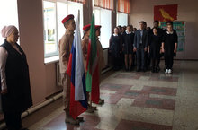 Уку атнасы тантаналы линейкадан башланып китте. Линейкада Россия һәм Татарстан республикасы флаглары кертелде һәм гимн яңгырады/ Учебная неделя началась с торжественной линейки. На линейке были введены флаги России и Республики Татарстан и прозвучал гимн