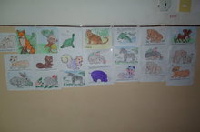 Яңгырлы көннәрдә саф һавада уйнап булмый, дип аптырап тормыйбыз, мәктәп эчендә дә үзебезгә шөгыль табабыз. Бүген, мәсәлән, җәнлек рәсемнәре буядык, аларныж кайда яшәве, нәрсә белән туклануы һ.б. турында кызыклы мәгълүматлар алдык.