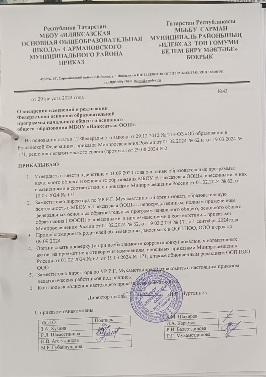 Муниципальное бюджетное общеобразовательное учреждение «Иляксазская основная общеобразовательная школа» Сармановского муниципального района Республики Татарстан / Татарстан Республикасы Сарман муниципаль районы МБГББУ "Илексаз төп гомуми белем бирү мәктәбе"