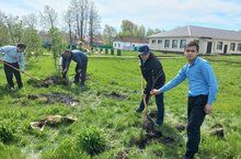 Директор школы Ш.М. Фатихов и учитель технологии Р. Ф. Сахбетдинов ,а также учащиеся 6 класса МБОУ "Кавзияковская ООШ" посадили яблонь на территории школы