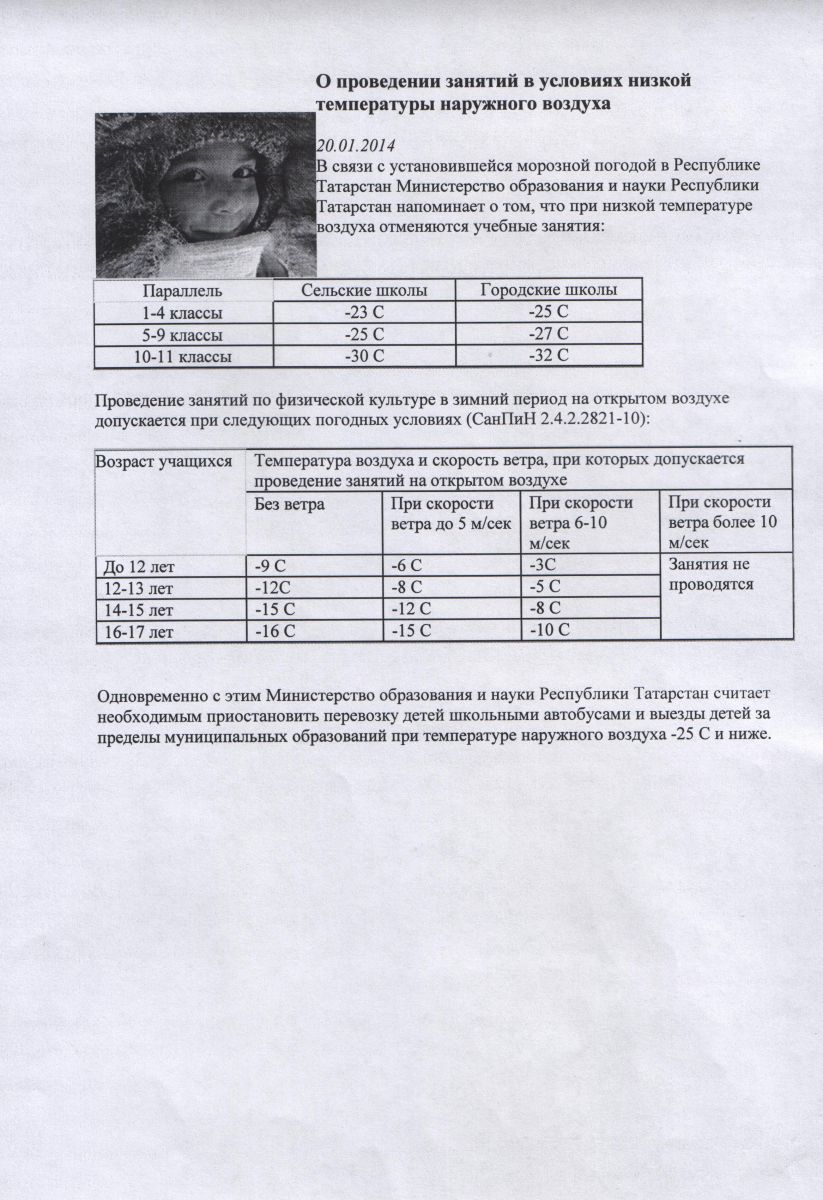 О проведении занятий в условиях низкой температуры наружного воздуха